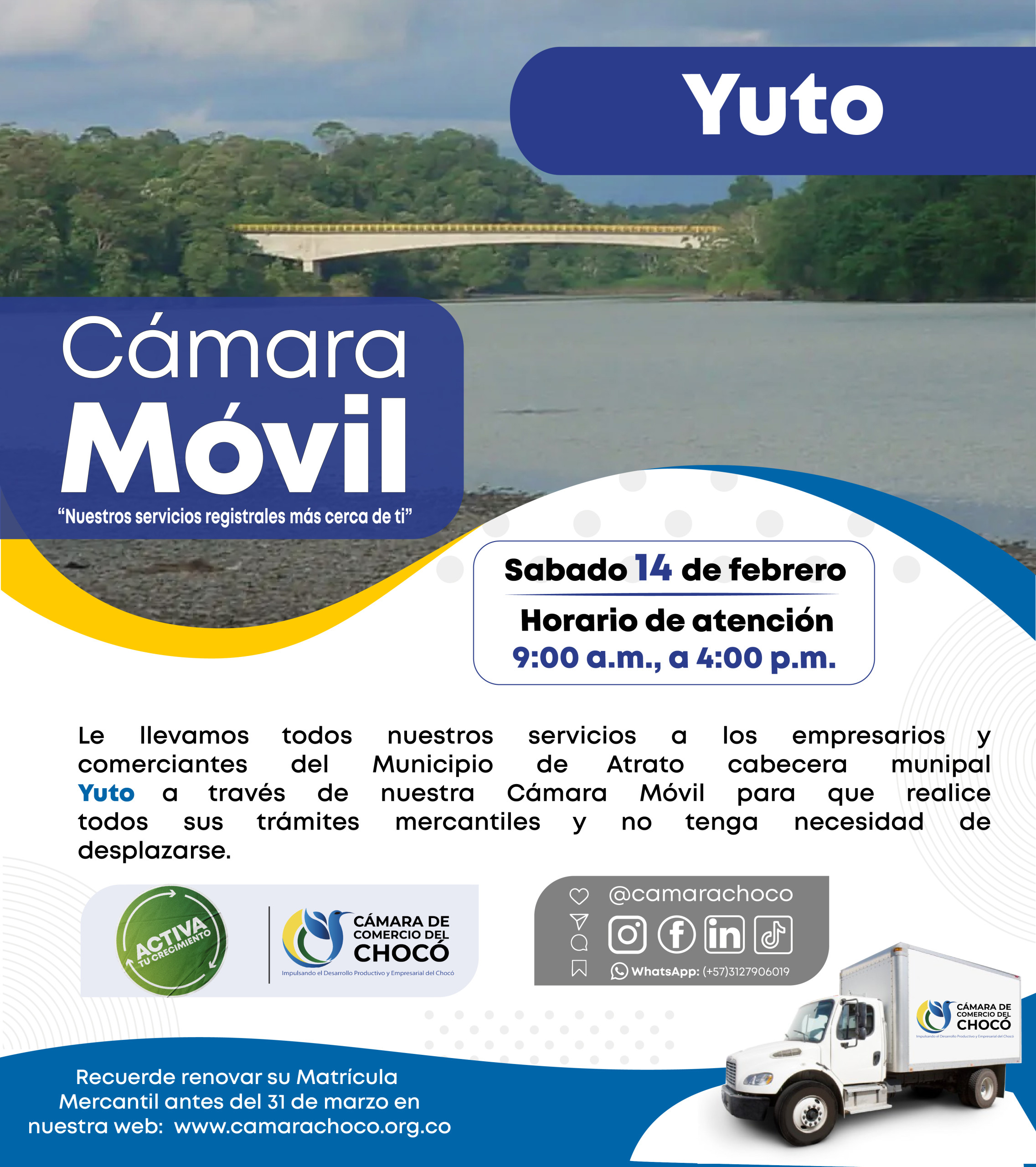 La Cámara de Comercio del Chocó, a través de su estrategia Cámara Móvil, realizará una jornada de atención al municipio de Atrato (Yuto), con el propósito de acercar los servicios empresariales y la gestión de trámites mercantiles a empresarios y comerciantes del territorio.